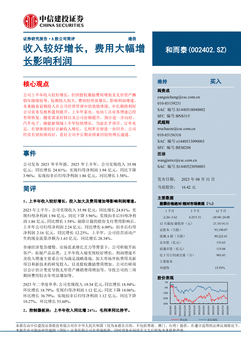 公司上半年收入较好增长,短期投入加大,费用较明显增长,影响利润增速,未来随着前期投入在公司经营管理中的效能体现,中长期将利好公司业务发展和盈利提升。上半年家电、电动工具业务增速已经有所恢复,随着需求好转以及公司份额提升,预计进一步向好。汽车电子、储能新领域上半年较快增长,当前在手项目、订单充足,有望继续较好贡献收入增长。毛利率有望进一步回升。公司经营有望持续向好,看好公司中长期业绩重回较快增长通道。我们预计公司2023年-2025年营收分别为75.7亿元、96.3亿元、126.0亿元,归母净利润分别为5.2亿元、7.2亿元、9.7亿元,对应PE分别为26x、19x、14x,维持“买入”评级。